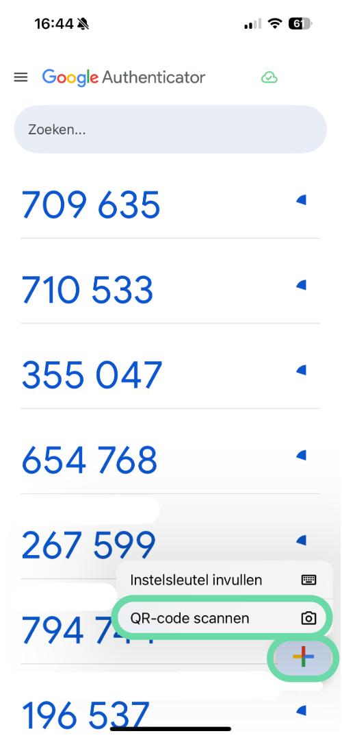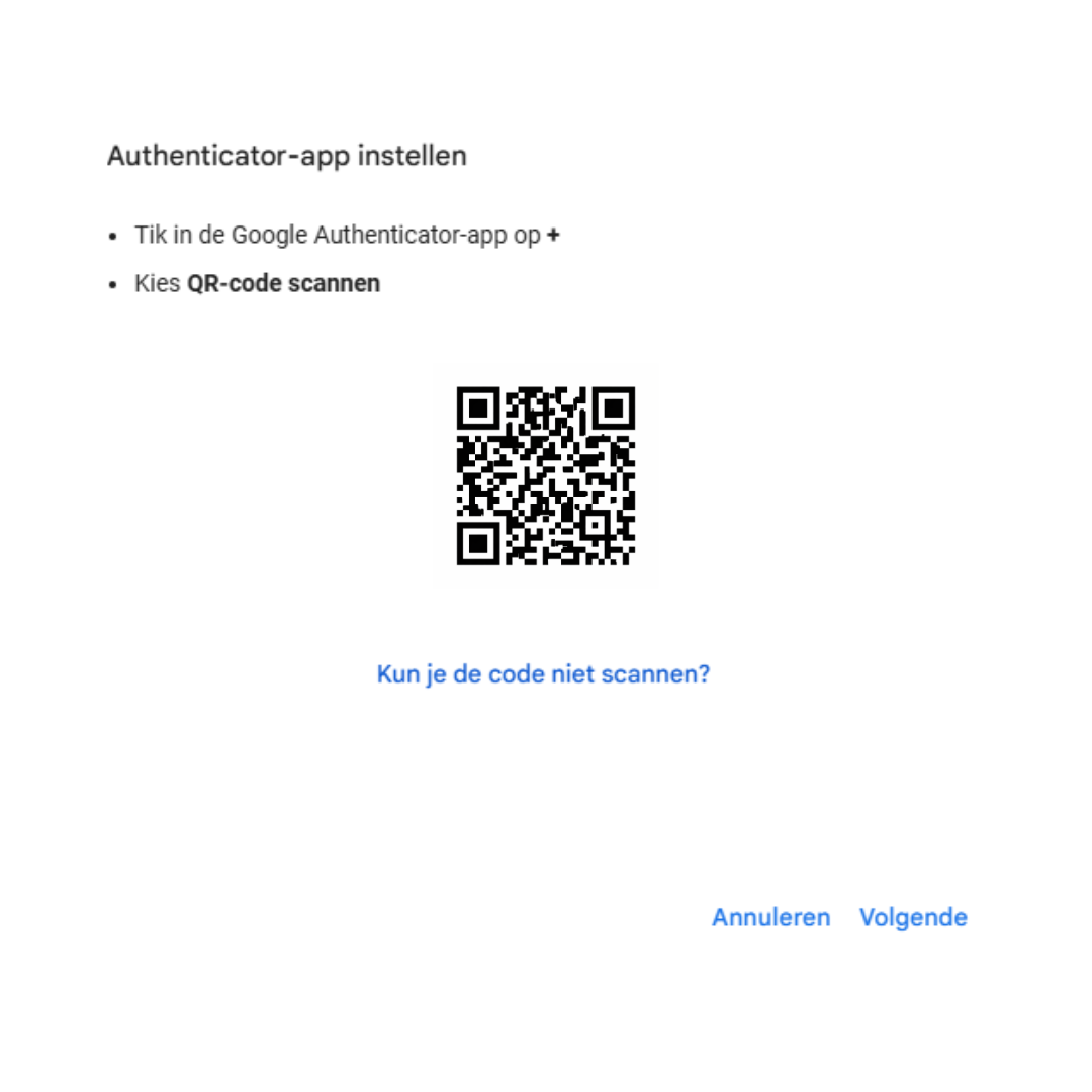 5. Scan de QR-code met uw Google Authenticator-app door op “+” te klikken en vervolgens op “QR-code scannen”.