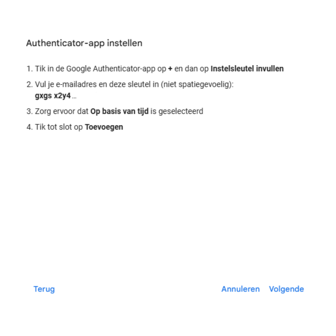 Klik op de link “Kun je de code niet scannen?” onder de QR-code om de informatie te verkrijgen die nodig is voor het handmatig invoeren van de instelsleutel.